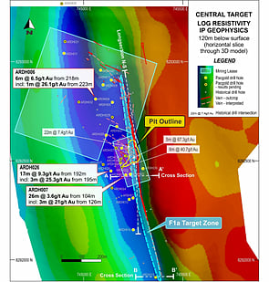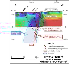 • 17m @ 9.3g/t Au from 192m incl. 3m @ 25.3g/t Au from 195m (ARDH026)