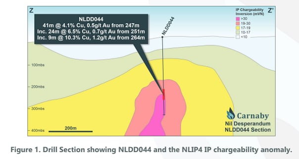 The results from NLDD044 have confirmed that the IP chargeability anomaly is almost certainly caused by the high-grade copper sulphide mineralisation intersected in NLDD044 (Figure 1).
